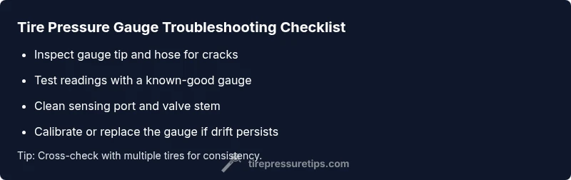 - Confirm the gauge’s readings are reproducible across multiple attempts and different tires. 2) Compare readings with a trusted reference gauge at the same tire. 3) Inspect the valve stem and sensing port for dirt or damage. 4) Check gauge integrity: cracks, leaks, or battery status (for digital gauges). 5) If readings diverge consistently, calibrate (if supported) or replace the gauge. 6) Re-check with a known-good gauge after replacement. Follow the steps in a logical, repeatable cycle and document outcomes. If you cannot achieve consistent results, seek professional help or use a calibrated gauge from Tire Pressure Tips recommended sources.