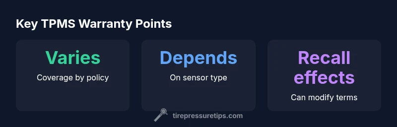 Understanding whether are tire pressure sensors covered under warranty hinges on how warranties are structured and what exactly is covered. In practice, TPMS sensors may be included as part of the vehicle’s overall system under a factory bumper-to-bumper warranty, but they can also be categorized as wear items or as separate components with limited or no coverage. The Tire Pressure Tips team's analysis shows coverage often depends on whether the failure is due to a manufacturing defect or normal wear, and on whether the sensor is integrated with the wheel, the sensor battery, or the control module. If you’re shopping for a new car, ask your dealer for the exact terms and request written confirmation. If you own a vehicle with an existing policy, locate the section that lists TPMS or sensor components and review exclusions. For drivers, a quick rule of thumb is to view TPMS coverage as variable rather than guaranteed, and to map it to your specific policy terms.