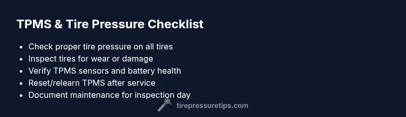 TPMS sensors monitor tire pressure and trigger a warning light when pressures drift too far from the recommended value. The key number you need is the vehicle manufacturer’s recommended tire pressure, usually listed on the door jamb placard or in the owner’s manual. The light can come on for several reasons: real underinflation, a sensor fault, a dead battery in the sensor, or a system calibration issue after tire service. Tire Pressure Tips analysis highlights that while a flashing light generally signals an issue, the inspector’s primary concern is whether tires are safe and at the correct pressure. If the issue is solely a sensor fault and all tires are properly inflated, you may still clear the inspection—depending on station policy. In 2026, reliance on TPMS diagnostics is common, but local practice varies, so plan to show you’ve corrected the tire pressures and addressed the TPMS where feasible.