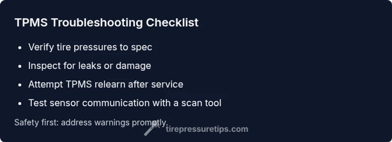 A structured diagnostic path helps isolate issues quickly. Start with the most common, easiest checks (pressure verification, visible leaks). If the TPMS light remains on after confirming correct pressures, proceed to sensor-related checks (battery life, sensor position, relearn needs). If you still cannot resolve the warning, escalate to professional service for sensor testing or replacement.