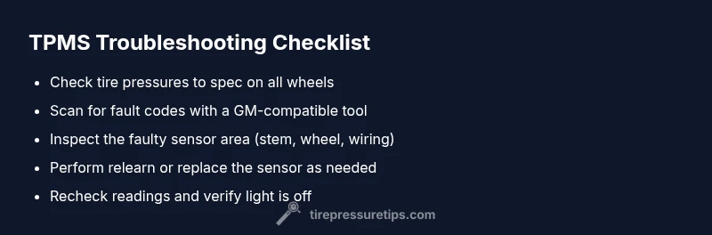 - Check tire pressures on all wheels and adjust to the manufacturer’s specification. Do not rely on the dashboard readout alone. 2) Inspect the valve stems for damage, corrosion, or debris; replace any questionable stems. 3) Use a TPMS diagnostic tool to read fault codes and locate the faulty wheel. 4) If a specific sensor is indicated, attempt a relearn procedure per GM guidelines or replace the sensor if the codes persist after relearn. 5) After any sensor replacement, perform a system relearn and verify readings on all four wheels. 6) If the warning remains after these steps, inspect wiring and consult a professional. Each fix has its own difficulty level, from easy inflation checks to hard sensor replacement and programming.