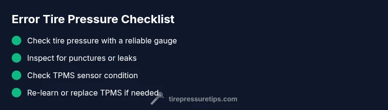 Error tire pressure warnings are usually caused by a faulty TPMS sensor, a slow tire leak, or a temperature-driven pressure change. Start with simple checks: inspect tires for visible damage and inflate to the recommended pressure, then use the diagnostic flow to identify the root cause. If the warning persists, follow the step-by-step guide below for safe fixes.