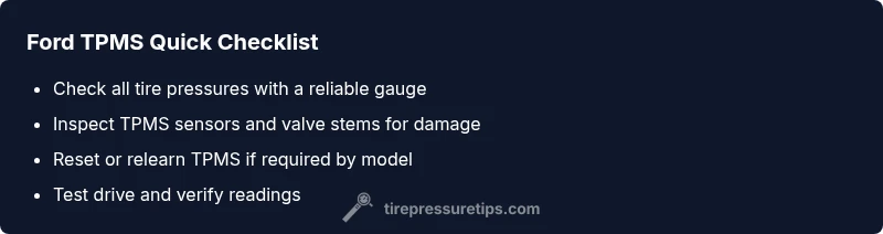 A practical troubleshooting guide to diagnose and fix Ford TPMS warnings, with at-home checks, diagnostic flow, step-by-step repairs, and safety tips. Learn how to interpret TPMS signals and keep Ford vehicles safely inflated.