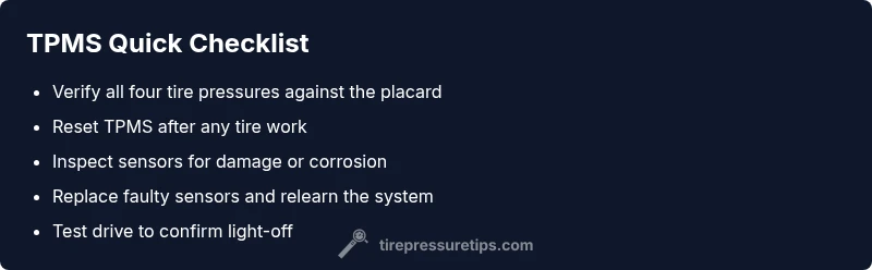 TPMS lights can indicate sensor faults, calibration needs, or hidden tire pressure issues. Start with a fresh tire pressure check and reset if available, then check sensors if the light persists.