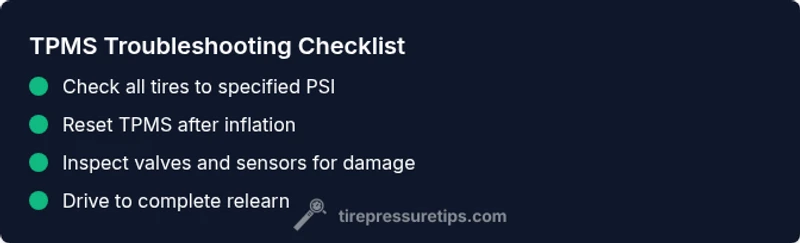 After correcting pressures, perform the TPMS relearn process as described in the owner’s manual or the service port menu. This allows the system to re-acknowledge fresh sensor data after inflation changes.