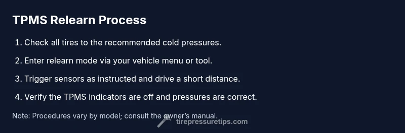 After completing the relearn steps, verify that all four tires report the correct pressures and that the TPMS indicator turns off. Drive the car for a short distance as recommended by your manual (often 5-10 miles at steady speeds) to allow the system to confirm sensor data in real-world conditions. If the light stays on or blinks, revisit the steps, confirm sensor health, and consult the vehicle manual or a technician.