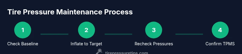 - Confirm you have the correct target pressure from the placard. 2) If a tire is underinflated, apply air in small 1–2 psi increments and recheck after each increment. 3) Do not exceed the maximum pressure printed on the tire sidewall or overinflate just to reach a target that doesn’t account for load. 4) After inflating to the target, recheck all four tires and ensure the changes are uniform. 5) If you notice a slow leak or a damaged valve stem, stop and seek professional service. 6) If the TPMS remains lit after inflation, have the system inspected by a qualified technician. Time estimate: 10–15 minutes for inflation and rechecks.