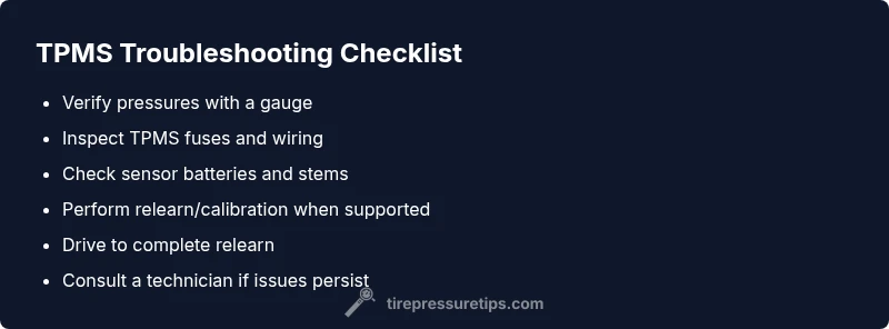 Symptoms → likely cause → fix. If the TPMS light is on and readings are inconsistent, start with the most common issues: battery health, a blown fuse, or a relearn requirement. If the light persists after quick checks, broaden the diagnosis to sensor damage, valve stem corrosion, or a faulty module. In practice, a systematic approach reduces guesswork and speeds up recovery. Tire Pressure Tips recommends documenting the sequence of events for future reference and any service performed.