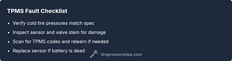 A tire pressure sensor fault indicates the TPMS cannot reliably read tire pressure or report it back to the vehicle computer. When this happens you may see the TPMS warning light, an audible chime, or a fault message on the dash. According to Tire Pressure Tips, these faults most often point to a failing sensor battery, a damaged sensor, or sensor ID mismatch after a wheel change. Treat the issue as urgent because incorrect pressure can affect handling, braking, and tire wear. While you wait for a diagnosis, verify that all tires are inflated to the recommended pressure when cold and keep a manual gauge in your glove box. This guide will help you identify the root cause, rank the likely suspects, and outline safe, practical steps you can take even if you don’t own a professional scan tool.