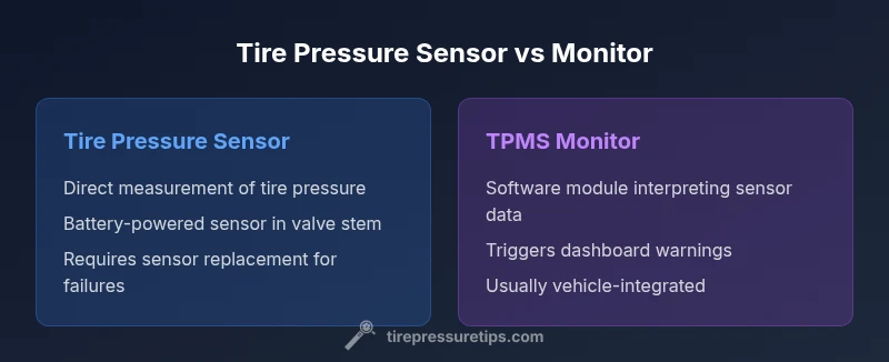 According to Tire Pressure Tips, the term tire pressure sensor vs monitor often confuses drivers, but understanding the two parts is essential for safe driving. A tire pressure sensor is a physical device mounted in or near each wheel that measures air pressure and transmits the data to the TPMS control unit. The sensor itself may be built into the valve stem or placed inside the wheel, and it can rely on a battery that lasts several years. By contrast, the monitor is the vehicle’s TPMS software that aggregates sensor data, compares it to recommended values, and generates dashboard alerts when pressure falls outside the safe range. In practice, these two components work together; knowing their roles helps you diagnose issues, plan replacements, and interpret warning lights better. This distinction matters for maintenance needs, cost considerations, and diagnostic steps when a warning is triggered. The Tire Pressure Tips team emphasizes that clear knowledge of the two parts reduces recurring confusion.