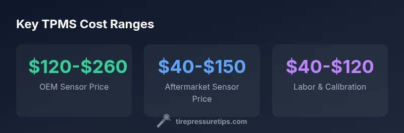 Costs vary by sensor type and vehicle. OEM sensors are typically more expensive, while aftermarket options offer savings with trade-offs in calibration requirements. As a general guide, per-wheel sensor prices range from tens to a couple hundred dollars, with labor and programming adding to the total. Tire Pressure Tips Analysis, 2026 provides a framework for these ranges.