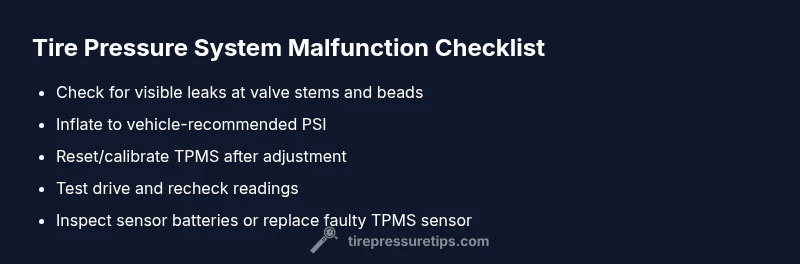 The tire pressure system malfunction is a warning that can affect safety, handling, and fuel efficiency. According to Tire Pressure Tips, the issue usually points to a TPMS sensor fault, a dinged valve stem, or calibration drift in the sensor electronics. You'll often see a dashboard warning light or an erratic tire-pressure readout, sometimes accompanied by one tire reading low while others remain normal. This article provides a practical, no-nonsense troubleshooting approach that helps you decide whether you can fix it yourself or should visit a shop. By following a structured process, you can prioritize safety, verify actual pressures, and determine whether components need cleaning, calibration, or replacement.