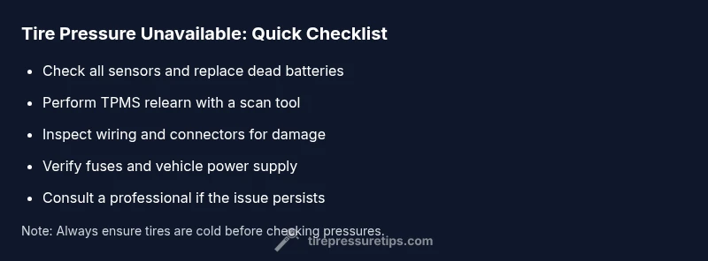 Urgent troubleshooting guide for tire pressure unavailable. Learn quick checks, a diagnostic flow, step-by-step fixes, and safety tips to restore TPMS readings and prevent future issues.