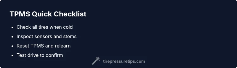 If the TPMS light remains after a reset and relearn, use a diagnostic tool or visit a shop to check the sensors and battery condition.