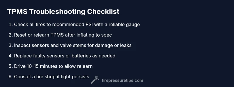 The light can stay on if the system hasn’t relearned after inflation, if there’s a slow leak, or if a sensor is faulty. Recheck pressures and perform a reset, then drive for a short distance to allow relearn.