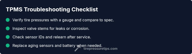 Most TPMS warnings come from the TPMS internal sensor signaling a fault or low battery. Start with the basics: ensure the wheel is properly inflated, check for recent tire changes, and scan for sensor fault codes using a TPMS tool. If the light remains on, recalibrate or replace the sensor, and verify the battery, receiver, and valve stems before seeking professional help.