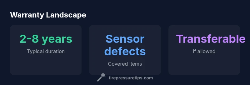 Warranty duration for TPMS components is not standardized across the automotive industry. Some manufacturers align TPMS coverage with the vehicle warranty, while others offer a separate plan with independent terms. Expect a broad range, typically between 2 and 8 years, or a mileage-based limit such as 50,000–100,000 miles, depending on the policy. Regional regulations and dealer practices can tighten or loosen these terms. The Tire Pressure Tips analysis highlights that buyers often encounter extended coverage for higher-end OEM sensors and shorter terms for budget components or aftermarket replacements. Always confirm whether the coverage starts at the point of purchase or at sensor installation, and whether the coverage follows the vehicle or the sensor unit itself.