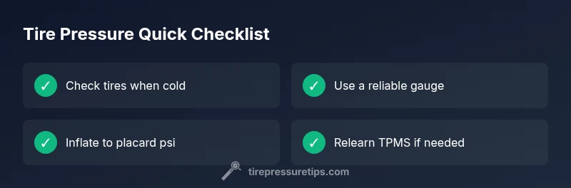 When you see the tire pressure warning illuminate on your dashboard, it signals that the vehicle's system has detected an issue related to tire pressure or the TPMS itself. The most common cause is that one or more tires are underinflated, which can affect safety, fuel economy, and tire wear. Temperature changes—especially in colder weather—can also trigger the light by reducing air pressure in the tires. According to Tire Pressure Tips, this warning should prompt a quick, methodical check rather than a panic response. Start by confirming the tires are cold, then use a reliable gauge to compare each wheel's pressure to the cold-psi spec on the door jamb placard. If readings are low, inflate to spec and recheck. If the light remains after inflation, you may have a faulty sensor or a slow leak that requires professional attention.