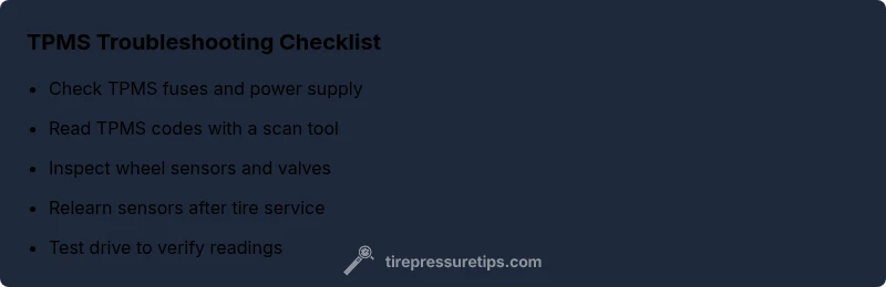 Here’s the quick path to resolution: 1) Check fuses and the TPMS power supply. 2) Scan the system for TPMS codes and sensor communication. 3) Relearn or recalibrate the sensors after tire service. 4) If the light stays on, inspect sensors for damage or replace a failed unit. This approach prioritizes safety and avoids guesswork today.