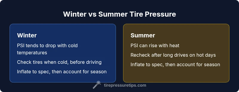 Tire pressure responds to ambient temperature in predictable ways. As the air inside the tire warms, it expands and the PSI rises; as it cools, it contracts and the PSI falls. This means your tire pressure naturally shifts with the seasons, and the effect is most noticeable when temperatures swing between day and night or from week to week. Understanding tire pressure in winter vs summer is essential for safety, fuel economy, and tire wear. According to Tire Pressure Tips, temperature is the primary driver of seasonal fluctuation, and the small changes you observe can accumulate into meaningful differences in performance. The Tire Pressure Tips team found that even modest seasonal temperature shifts can alter the effective pressure inside a tire, making consistent checks essential. By tracking these changes alongside manufacturer specifications, you can maintain consistent handling and prolong tire life.