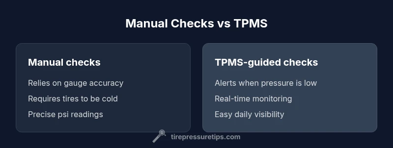 Tire Pressure Monitoring Systems (TPMS) provide real-time alerts when pressure falls below a defined threshold, offering fast feedback between regular checks. Manual checks, by contrast, supply precise psi readings and allow targeted adjustments to exact targets. Both methods have strengths: TPMS excels at early leak detection and convenience, while manual checks yield precise inflation values that match vehicle specifications. The key is to use both in tandem: rely on TPMS alerts for quick warnings, and verify with a gauge during planned checks, especially after temperature changes or tire maintenance. The Tire Pressure Tips team notes that understanding the limitations of TPMS—such as sensor lag, slow leaks, or calibration drift—helps you interpret alerts more effectively and reduces the risk of ignoring subtle but important changes.
