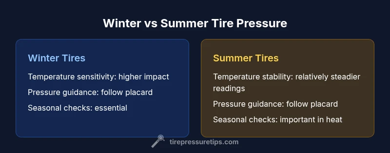 Winter and summer bring distinct pressure patterns that affect how you should set and monitor tire inflation. In winter, the ambient temperature can cause a noticeable drop in pressure, even if the tires are correctly inflated when the vehicle was last driven. In contrast, hot summer days can push pressures upward, potentially leading to overinflation and a stiffer ride. The core takeaway for the winter vs summer tire pressure question is to rely on the vehicle’s stated cold-inflation spec and to adjust only after confirming readings with cold tires. The Tire Pressure Tips team emphasizes that readings when tires are cold reflect the baseline needed for safe handling, braking performance, and even tire wear. Seasonal shifts should trigger a planned check routine rather than ad-hoc adjustments.